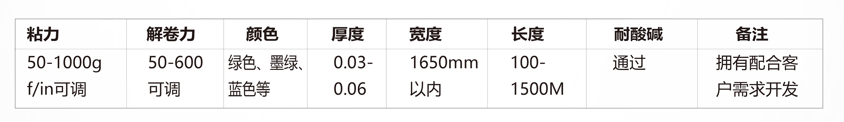 ? 產(chǎn)品規(guī)格齊全,剝離強(qiáng)度適中,解卷力大小均一,滿足自動(dòng)化生產(chǎn)線需求;